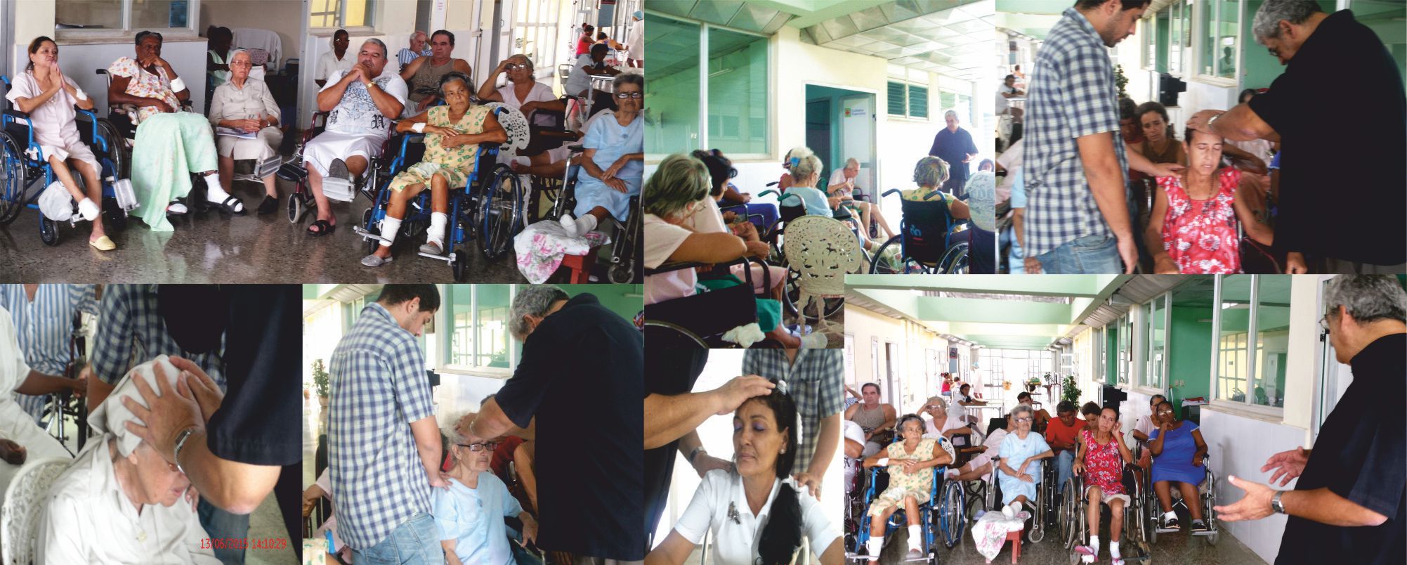 En esta ocasión pudimos entrar en una sala del Hospital del Rincón en la Habana, el sábado 13 de junio. Los enfermos, -muchos en sillas de ruedas-, se congregaron fuera de las habitaciones y después de los saludos iniciales y la invocación del Espíritu Santo, les hicimos cercano el Amor de Dios mediante la predicación, las alabanzas y los testimonios. Finalmente oramos por cada uno de los enfermos pidiéndole a Jesús misericordioso por su salud espiritual, interior y física. |