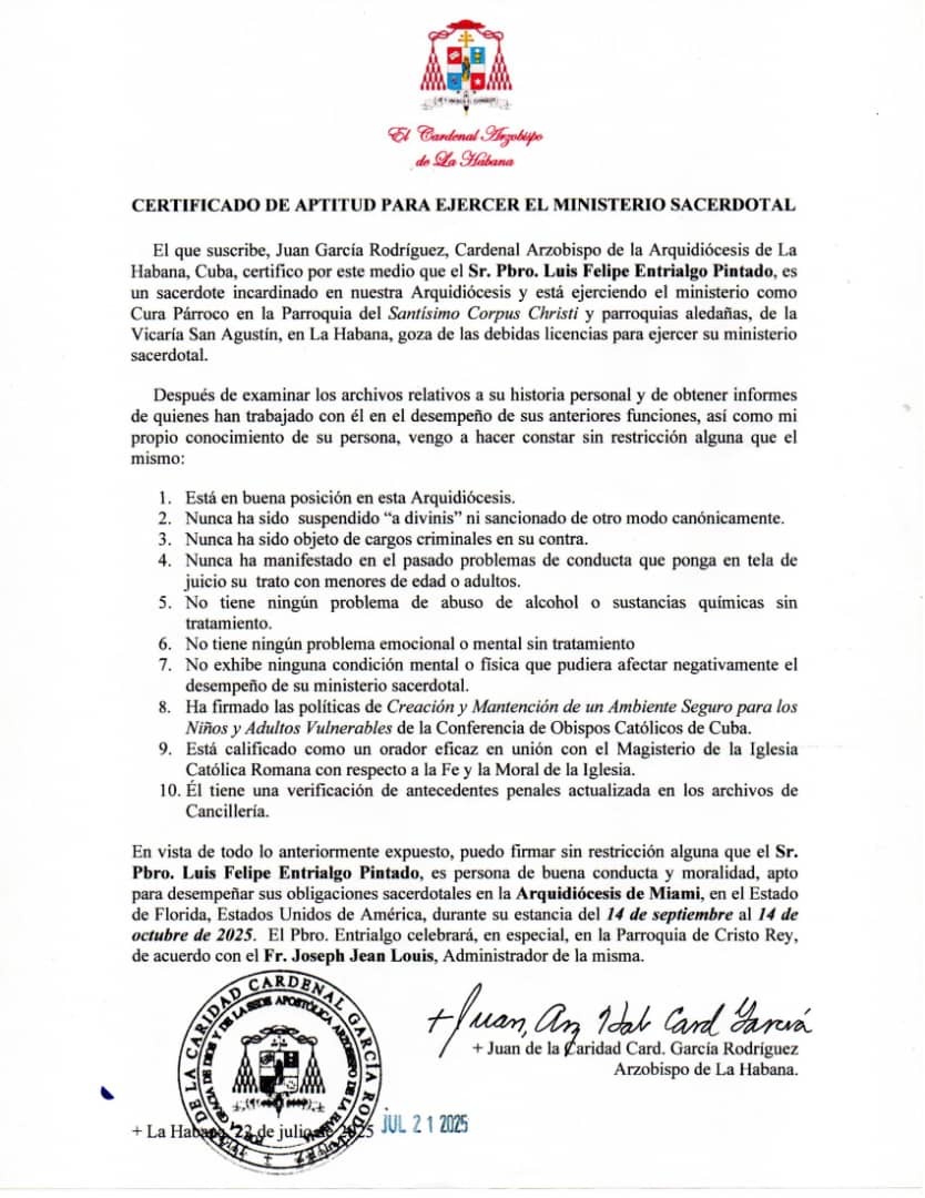 Carta de mis Facultades en Archidiocese of Miami